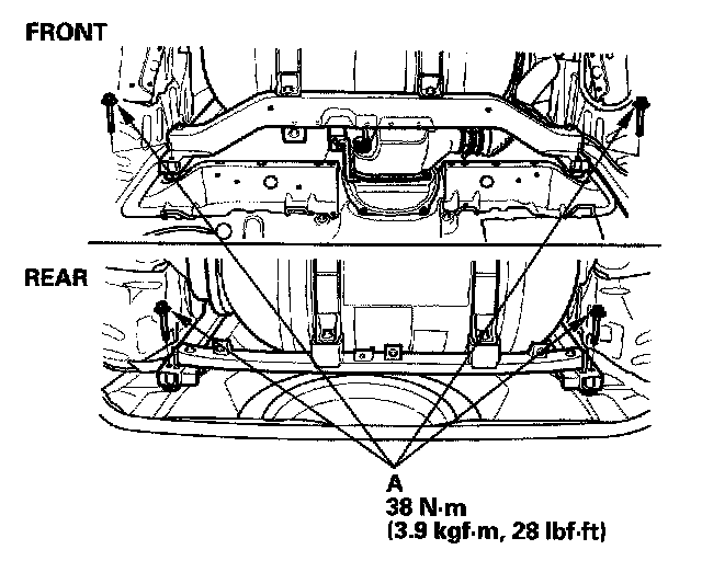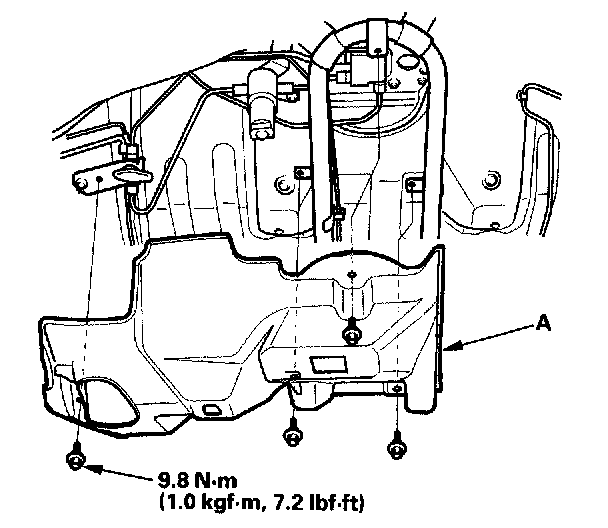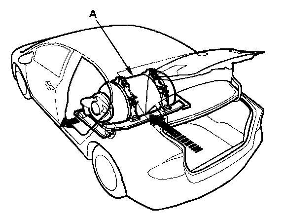 19. With the help of two other technicians, lift the frame, and slide the entire fuel tank assembly (A) into the passenger compartment. Be careful not to damage the fuel joint block.