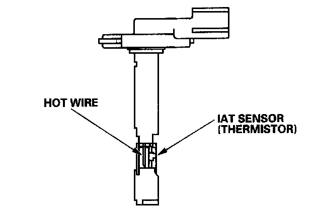 Mass Air Flow (MAF) Sensor/Intake Air Temperature (IAT) SensorThe mass air flow (MAF) sensor/intake air temperature (IAT) sensor contains a hot wire and a thermistor. It is located in the intake air passage. The resistance of the hot wire and thermistor change due to intake air temperature and air flow. The control circuit in the MAF sensor controls the current to keep the hot wire at a set temperature. The current is converted to voltage in the control circuit, then output to the PCM.