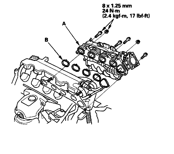 (A) with new gaskets (B), and tighten the bolts and nuts in a crisscross pattern in two or three steps, beginning with the inner bolt.