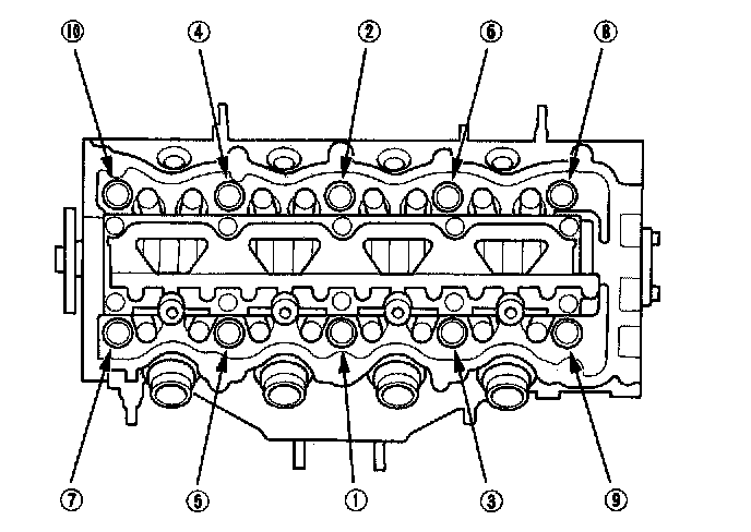 Tighten the cylinder head bolts in sequence to 39 Nm (4.0 kgf-m, 29 ft. lbs.). Use a beam-type torque wrench. When using a preset-type torque wrench, be sure to tighten slowly and do not overtighten. If a bolt makes any noise while you are torquing it, loosen the bolt and retighten it from the first step.