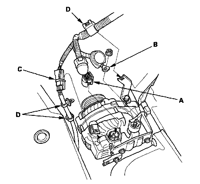 5. Remove the harness connector (C) and harness clamps (D) from the alternator.