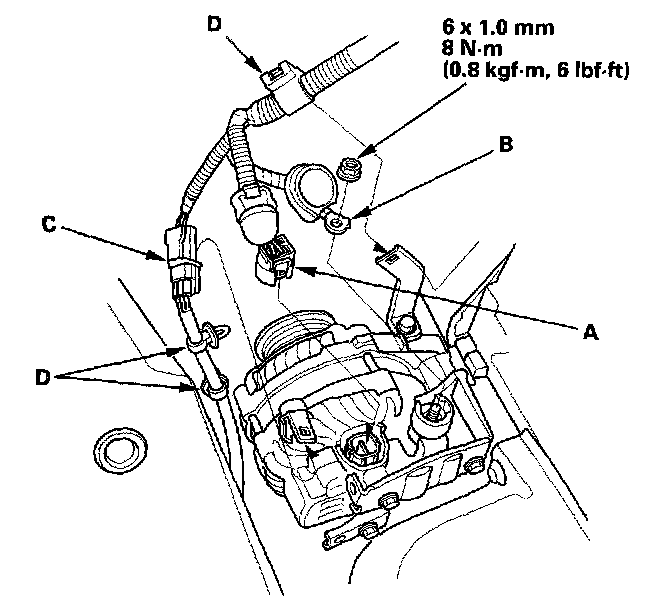 3. Install the harness connector (C) and harness clamp (D) to the alternator.