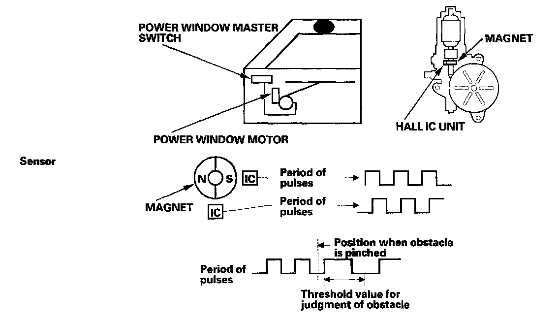 The driver's power window motor incorporates a pulser which generates pulses during the motor's operation and sends the pulses to the driver's power window control unit. As soon as the power window control unit detects no pulses from the pulser, the driver's power window control unit makes the power window motor stop and reverse. If the window is more than halfway closed, it will reverse to half open position. If the window is less than halfway closed, it will stop and reverse about 2 inches. This is to prevent pinching an obstacle during auto-up operation. The auto reverse operation is not active when the switch is held in the up position.