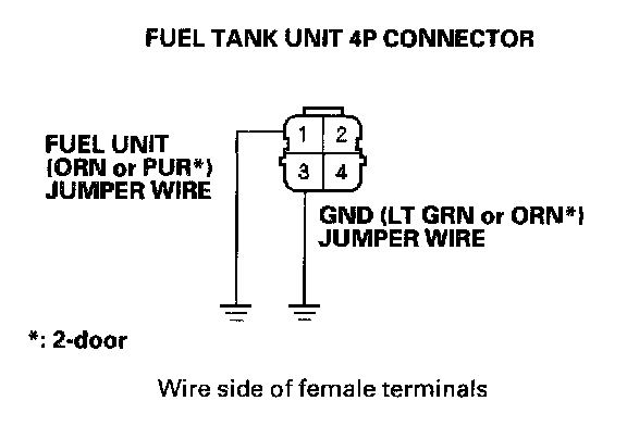 7. Connect the fuel tank unit 4P connector No. 1 and No. 3 terminals and body ground with jumper wires.
