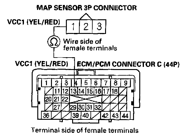 11. Check for continuity between ECM/PCM connector terminal C13 and MAP sensor 3P connector terminal No. 1.