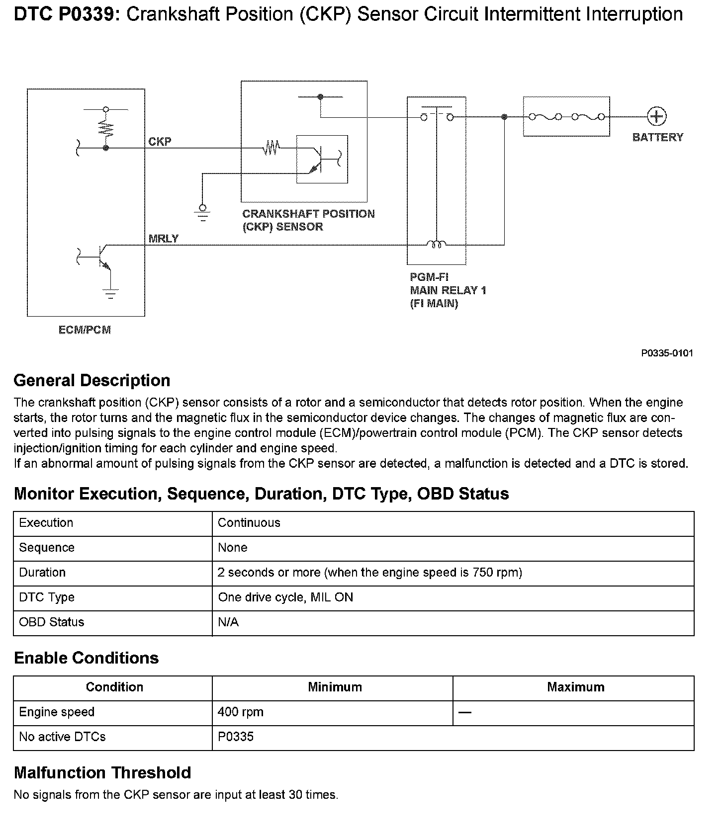 DTC P0339: CKP Sensor Intermittent InterruptionNOTE: Before you troubleshoot, record all freeze data and any on-board snapshot, and review the general troubleshooting information.