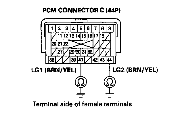 9. Check for continuity between PCM connector terminal C40 and body ground, and between terminal C44 and body ground.