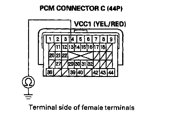 9. Check for continuity between PCM connector terminal C40 and body ground, and between terminal C44 and body ground.