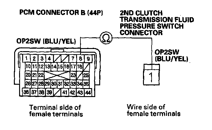 14. Check for continuity between PCM connector terminal B8 and 2nd clutch transmission fluid pressure switch connector terminal.