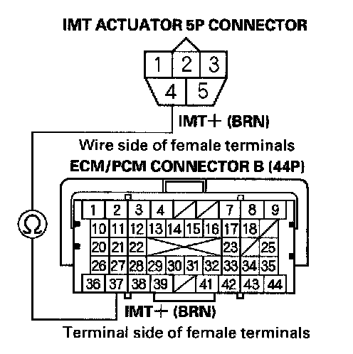 15. Check for continuity between IMT actuator 5P connector terminal No. 5 and ECM/PCM connector terminal B38.