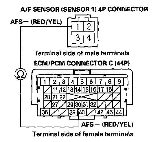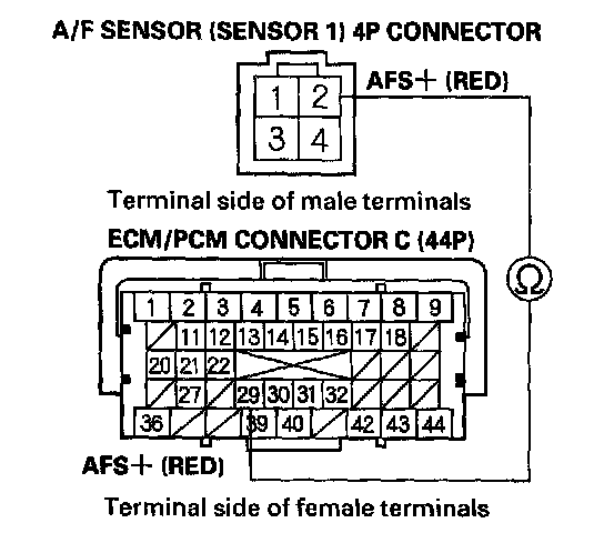 9. Check for continuity between A/F sensor (Sensor 1) 4P connector terminal No. 2 and ECM/PCM connector terminal C29.