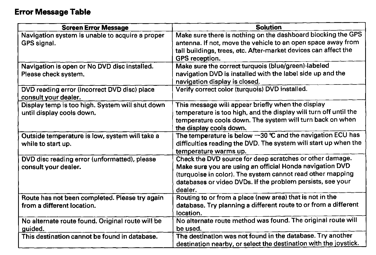 Error Message Table