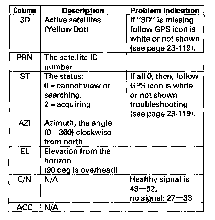 - If the row of data in the above table begins with a "yellow dot", the AZI and EL fields can be used to locate each satellite "PRN" # on the circular GPS diagram (see prior screen).