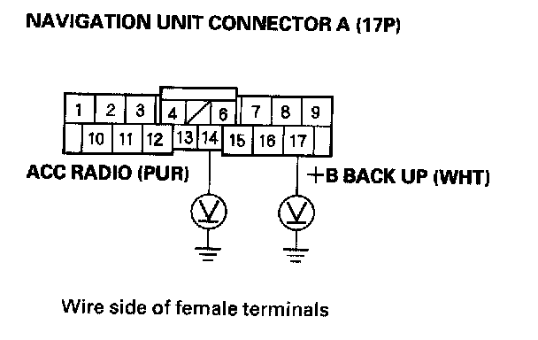 5. Measure the voltage between navigation unit connector A (17P) terminals No. 14 and body ground, and between terminal No. 17 and body ground.