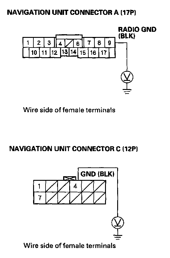 6. Check for voltage between the navigation unit connector A (17P) terminal No. 9 and body ground, and between navigation unit connector C (12P) terminal No. 4 and body ground.