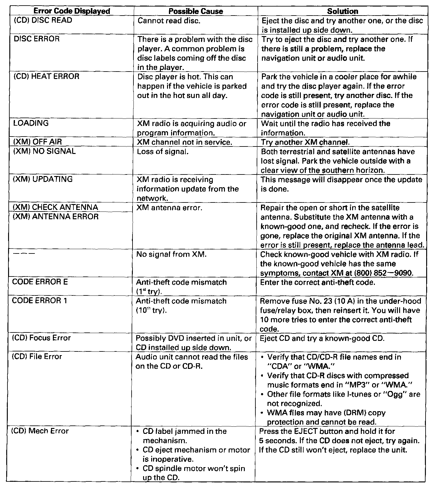 The audio system displays error codes when a problem is detected with the CD disc changer, the audio disc, the XM radio, or the anti-theft code.