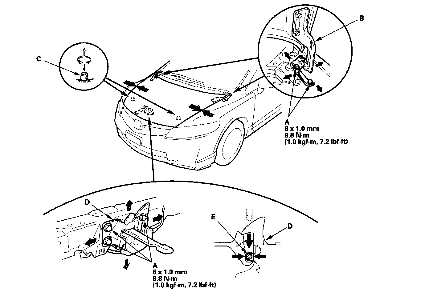 4. Adjust the hood latch (D) to obtain the proper height at the forward edge, and move the hood latch right or left until the striker (E) is centered in the hood latch.