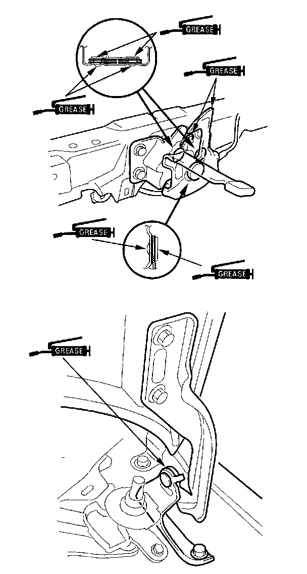 8. Apply multipurpose grease to the hood latch and hood hinges as indicated by the arrows.