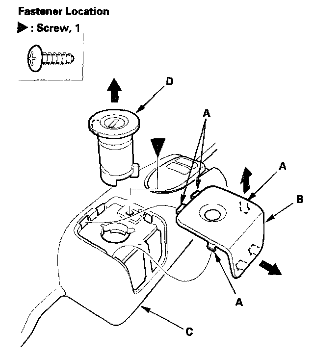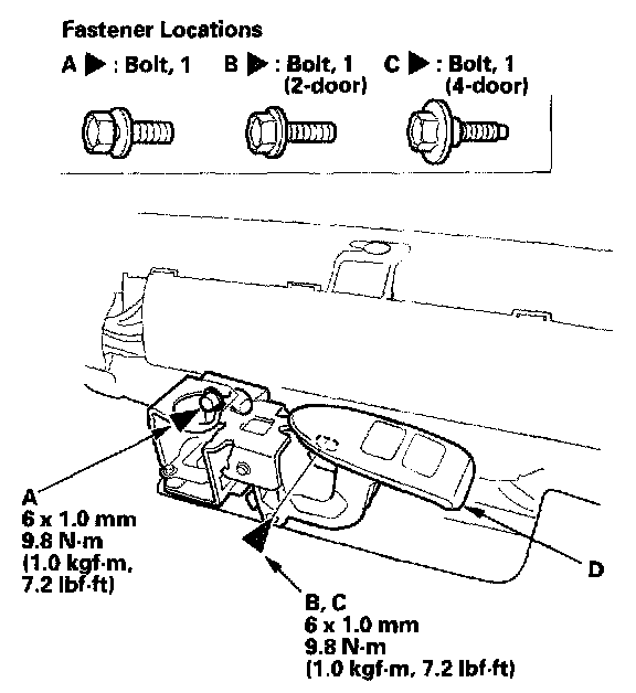 4. Loosen the bolt (A), and remove the bolt (B, C), then remove the trunk lid opener/fuel fill door opener (D).