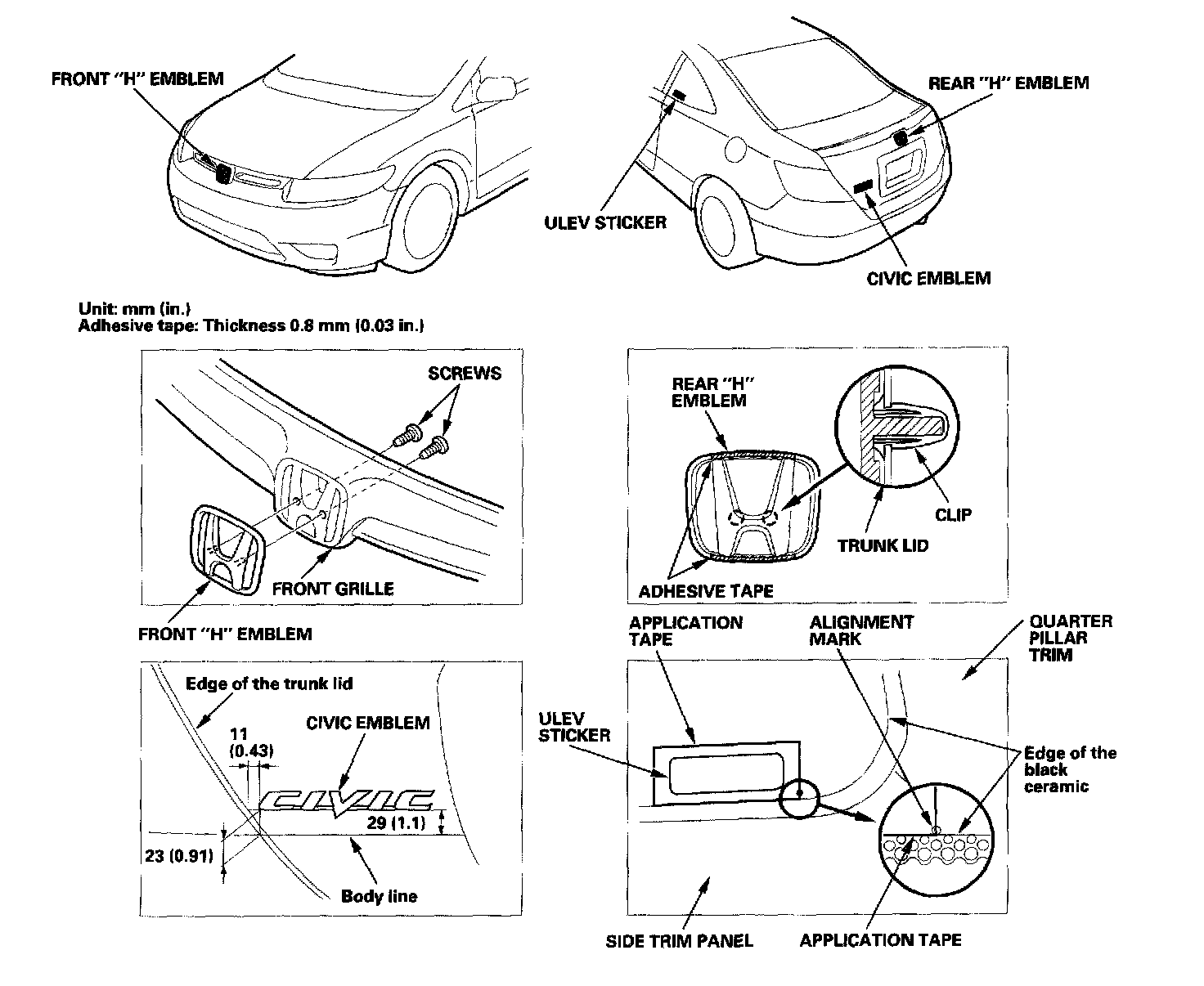 3. Apply the emblem/sticker where shown. When installing the ULEV sticker on the inside surface of the left rear door quarter glas6, align the sticker with the edge of the glass mark as shown, then press the sticker into place, and remove the application tape.