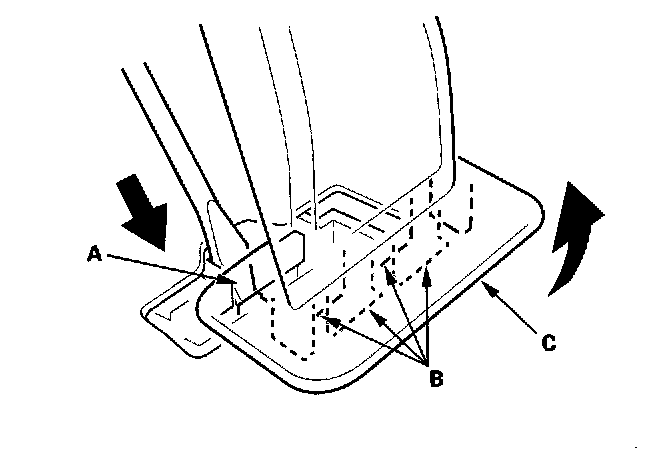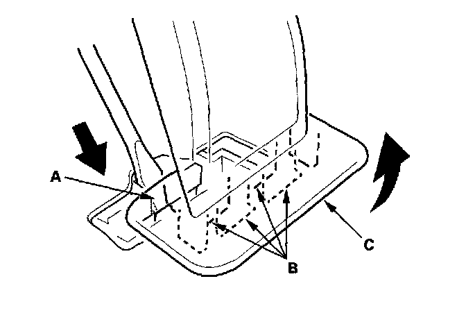 2. Push the knob (A) back to release the hooks (B) then pull up the accelerator pedal (C).