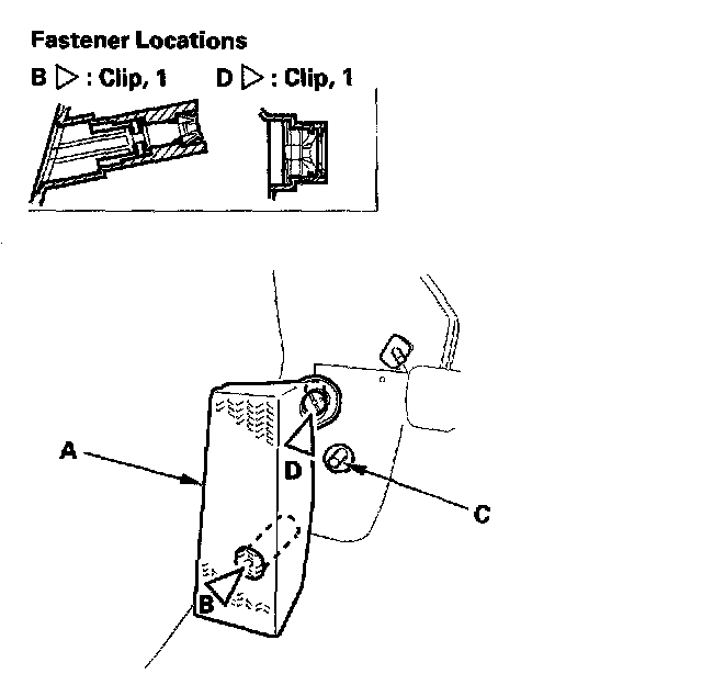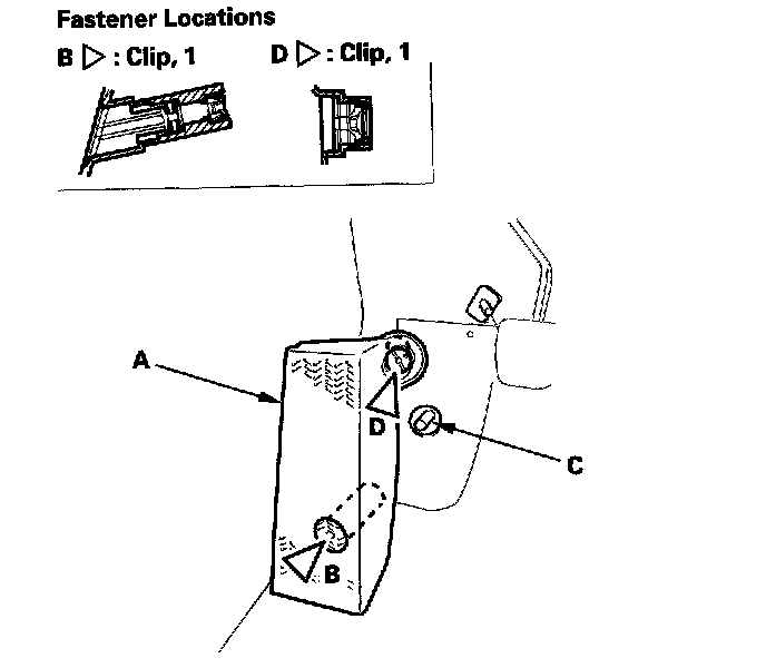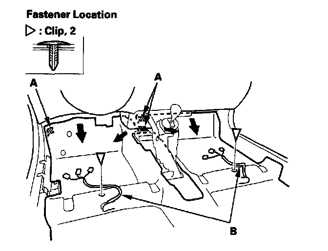 7. Release the clips. Release the fasteners (A), then pull the carpet out from under the dashboard.