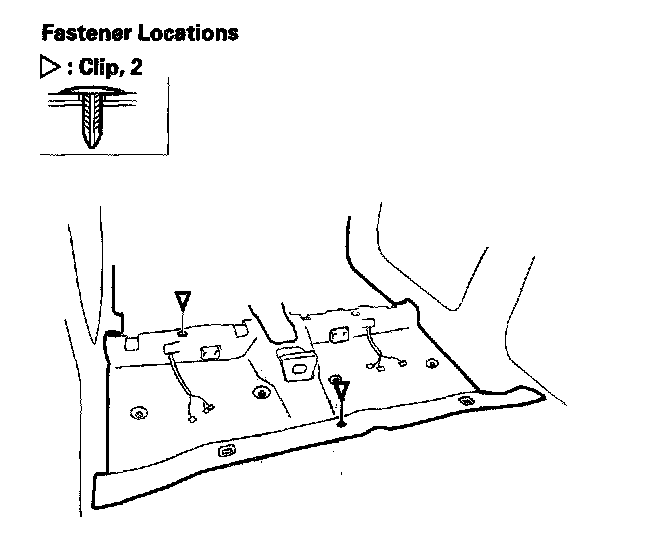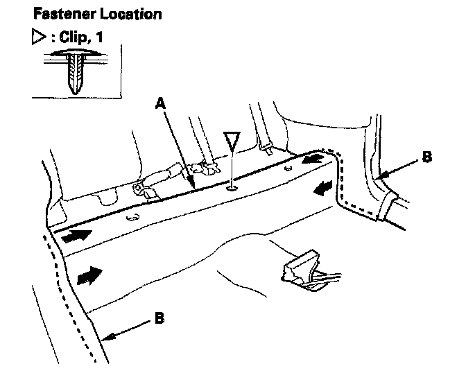 6. Release the clip from the rear portion of the carpet (A). Pull out the edge of the carpet from under both rear side trim panels (B).
