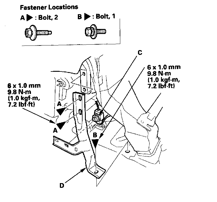 4. Remove the bolts (A, B), and detach the connector clip (C), then remove the center pipe extension (D).