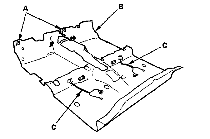 10. Pull the seat harnesses (C) out through the hole in the carpet, then remove the carpet.