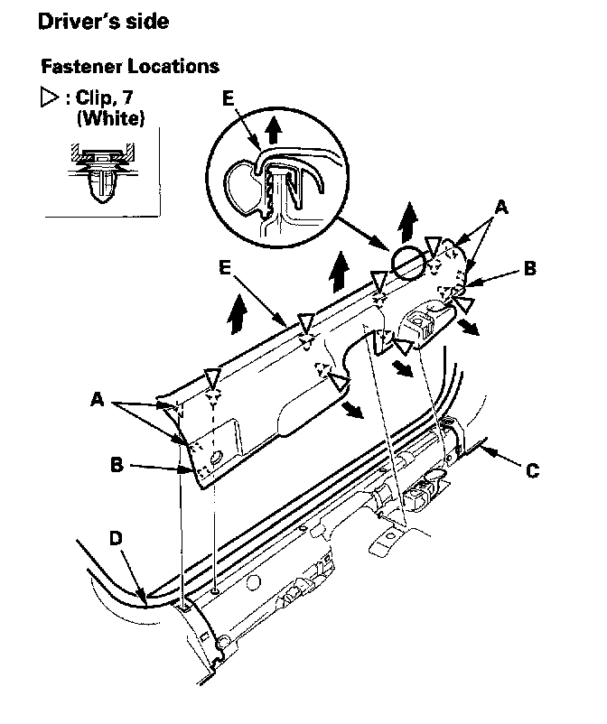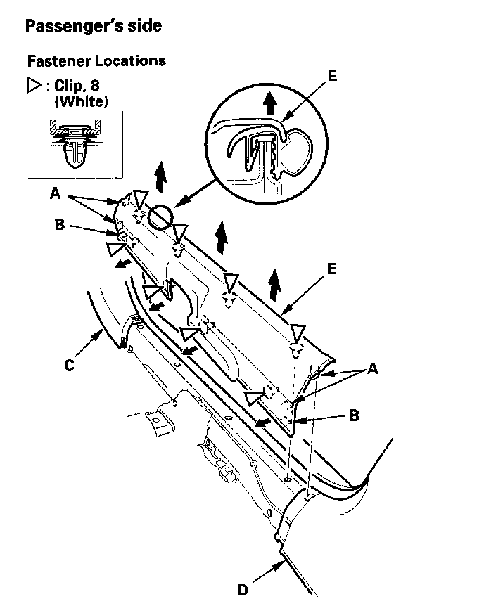 4. Detach the hooks (A) and tabs (B) from the kick panel (C) and rear side trim panel (D), and pull the door sill trim (E) up by hand to detach the clips, then remove it.