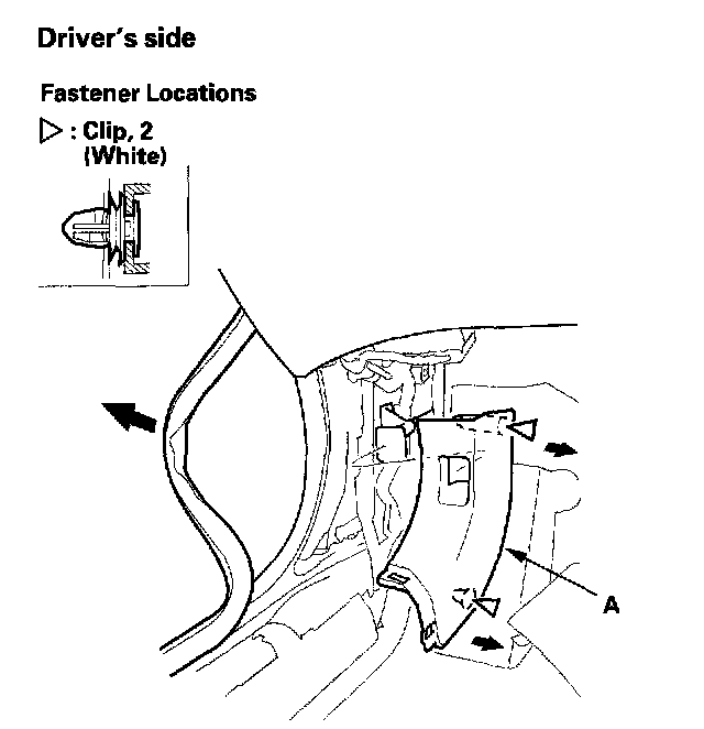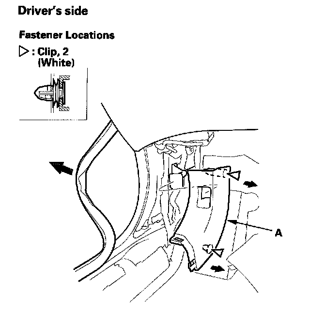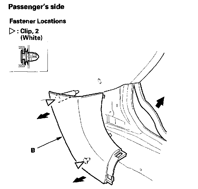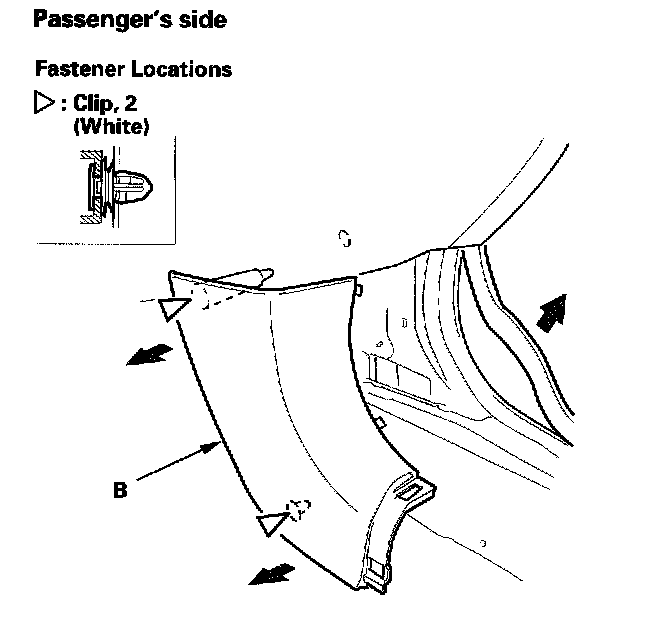 6. Pull the left kick panel (A) or the right kick panel (B) back by hand to detach the clips, then remove it.