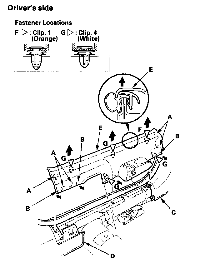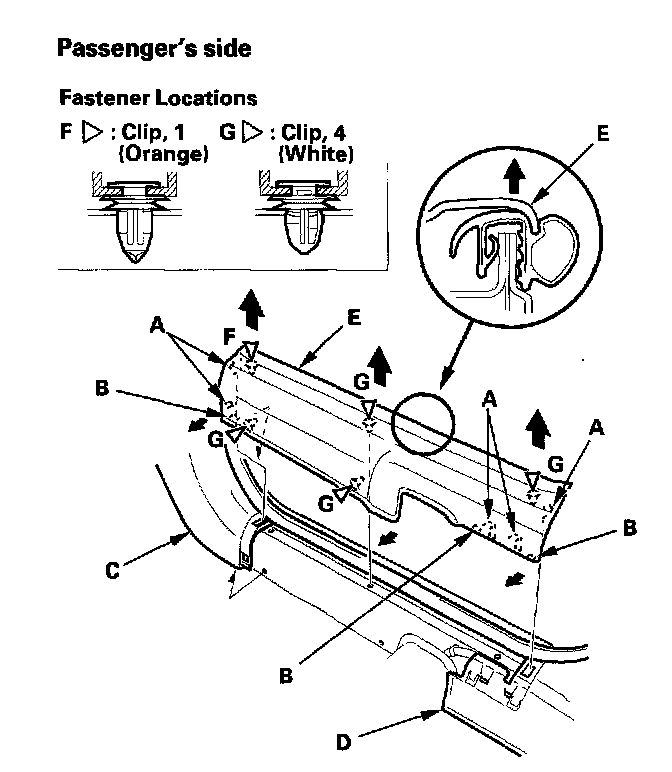 3. Detach the hooks (A) and tabs (B) from the kick panel (C) and B-pillar lower trim (D), and pull the front door sill trim (E) up by hand to detach the clips (F, G), then remove it.