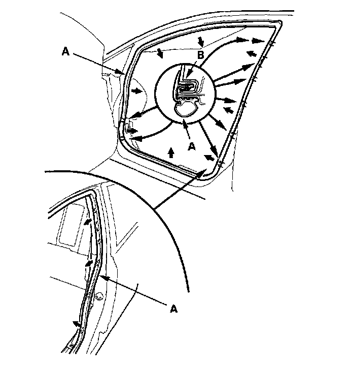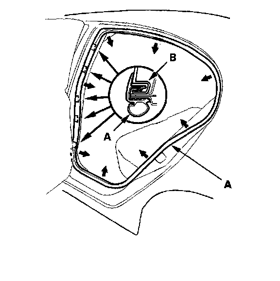 3. Pull out the rear door opening seal (A) from the trim hooks (B) and around the rear door opening flange, then remove the seal.