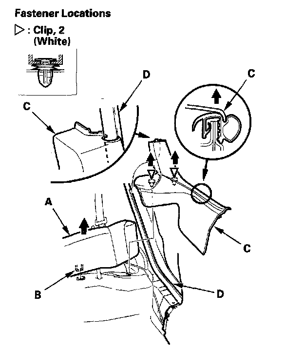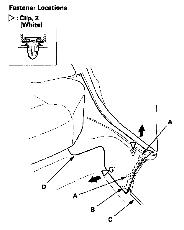 1. Detach the hook (A) and tab (B) from the B-pillar lower trim (C), and pull the rear door sill trim (D) up by hand to detach the clips, then remove it.