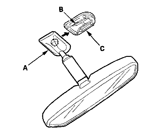 2. Slide the rearview mirror (A) down toward the bottom of the windshield to detach it from the spring (B) in the mount (C).