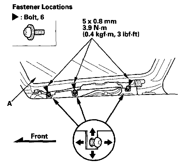 Glass Height AdjustmentThe roof panel (A) should be even with the glass weatherstrip (B), to within 0+1/-1 mm (0+0.04/-0.04 in.) all the way around, and should be to length of between the roof panel and glass, to within 13.5+1/-1 mm (0.55+0.04/-0.04 in). If not, make the adjustment: