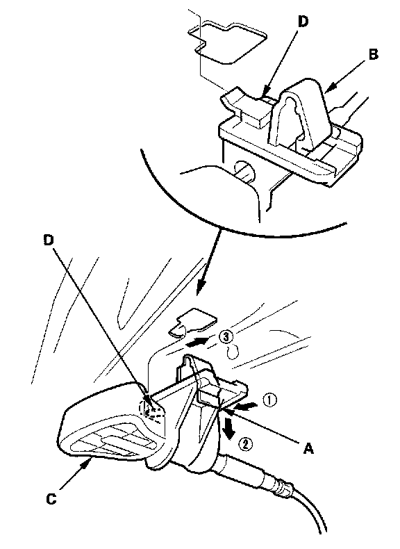 5. Push the tab (A) to release the hook (B), and rotate the seat-back release lever (C) clockwise to release the hook (D).