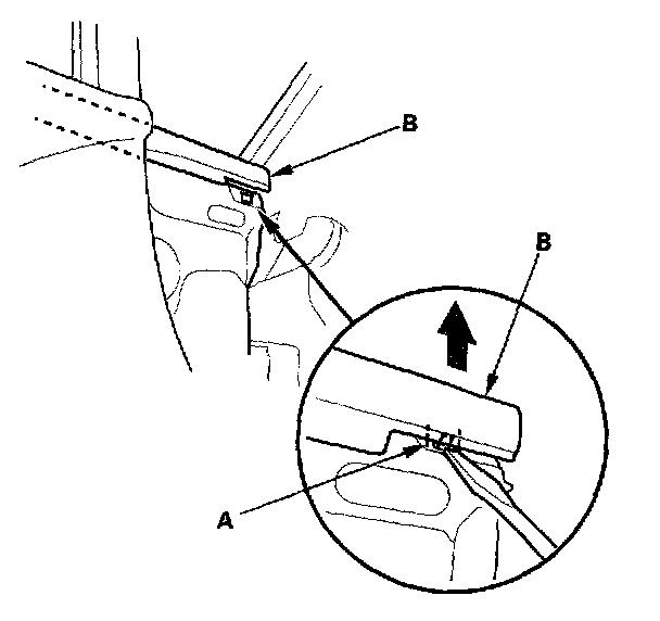 2. Release the front hook (A) from inside of the door, then pull up the front door glass outer weatherstrip (B).