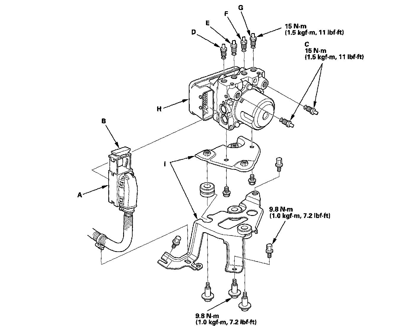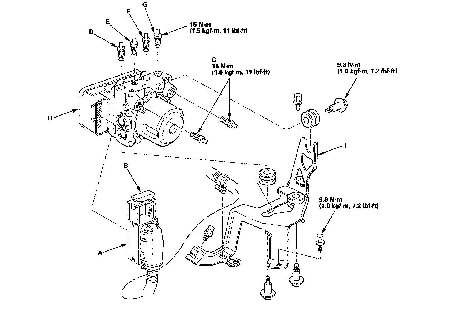 3. Remove the ABS modulator-control unit (H) with the bracket (I) from the body.