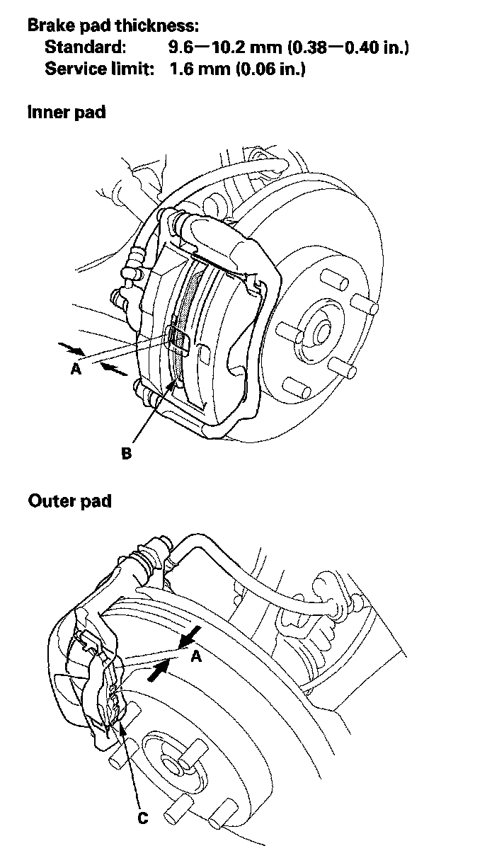 3. Check the thickness (A) of the inner pad (B) and outer pad (C). Do not include the thickness of the backing plate.