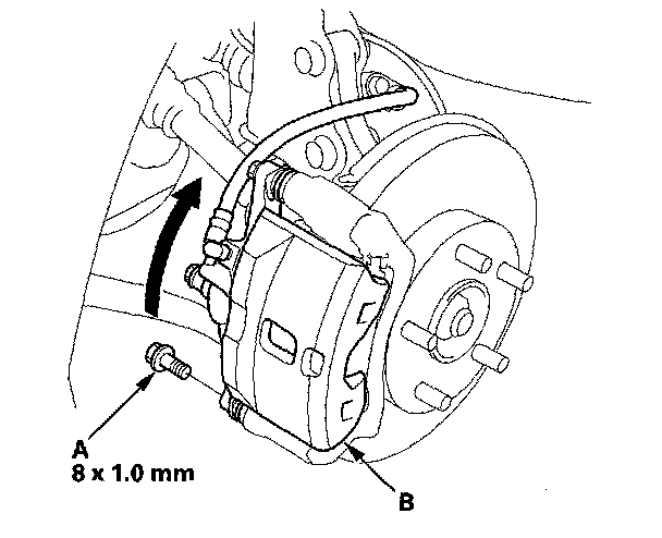 3. Remove the flange bolt (A), and pivot the caliper (B) up out of the way. Check the hose and pin boots for damage and deterioration.