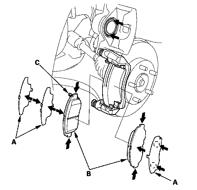 11. Install the brake pads and pad shims correctly. Install the brake pad with the wear indicator (C) on the upper inside. If you are reusing the brake pads, always reinstall the brake pads in their original positions to prevent a momentary loss of braking efficiency.