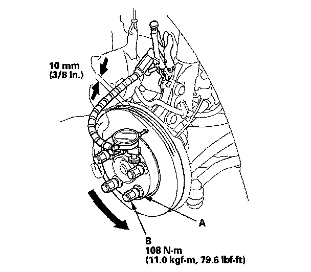 5. Install suitable flat washers (A) and wheel nuts (B), and tighten the wheel nuts to the specified torque to hold the brake disc securely against the hub.