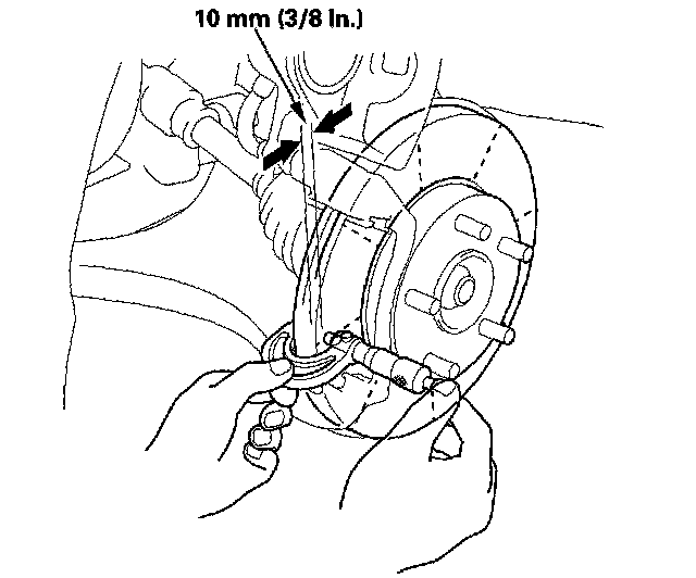 6. Set up the dial gauge against the brake disc as shown, and measure the runout at 10 mm (3/8 inch) from the outer edge of the brake disc.