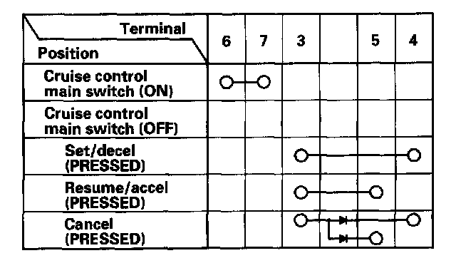 - If there is continuity, and it matches the table, but switch failure occurred on the cruise control input test, check and repair the wire harness on the switch circuit.