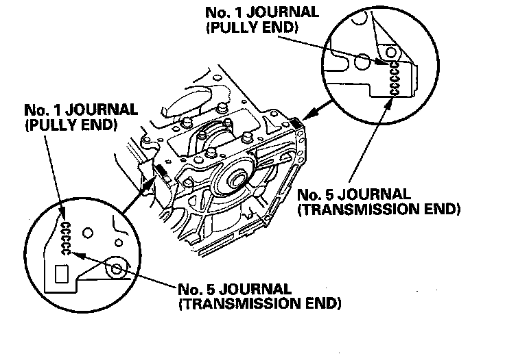 1. Numbers, letters or bars have been stamped on the either side of the block end as a code for the size of each of the five main journal bores. Write down the crank bore codes.