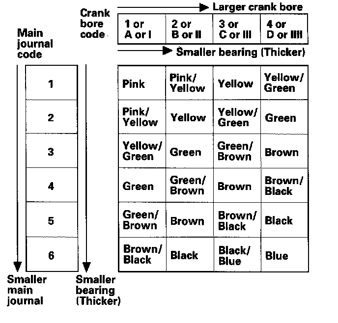 3. Use the crank bore codes and crank journal codes to select the appropriate replacement bearings from the table.