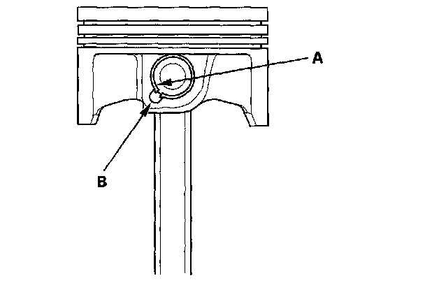 2. Apply new engine oil to the piston pin snap rings (A), and turn them in the ring grooves until the end gaps are lined up with the cutouts in the piston pin bores (B).