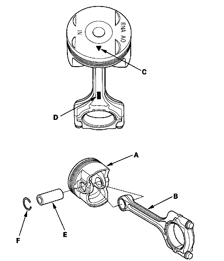 4. Assemble the piston (A) and connecting rod (B) with the mark (C) and the embossed mark (D) on the same side. Install the piston pin (E).