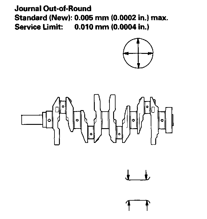 4. Measure the out-of-round at the middle of each rod and main journal in two places. The difference between measurements on each journal must not be more than the service limit.